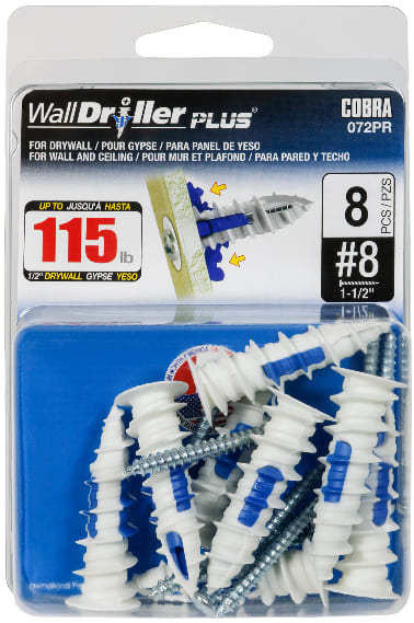 Screw Anchor, Wall Driller Plus, Plastic, with #8 Screws, 8/pkg