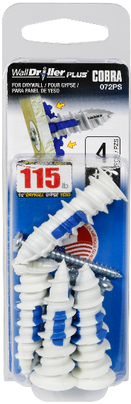 Screw Anchor, Wall Driller Plus, Plastic, with #8 Screws, 4/pkg