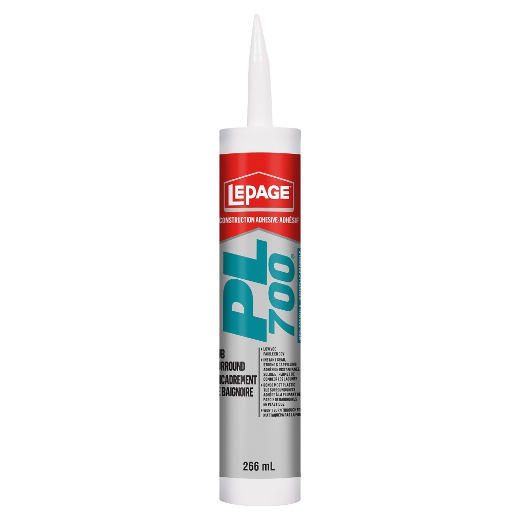 LePage PL 700 Tub Surround Adhesive is designed to bond most bathroom and shower enclosures without harming or burning the tub kit materials.