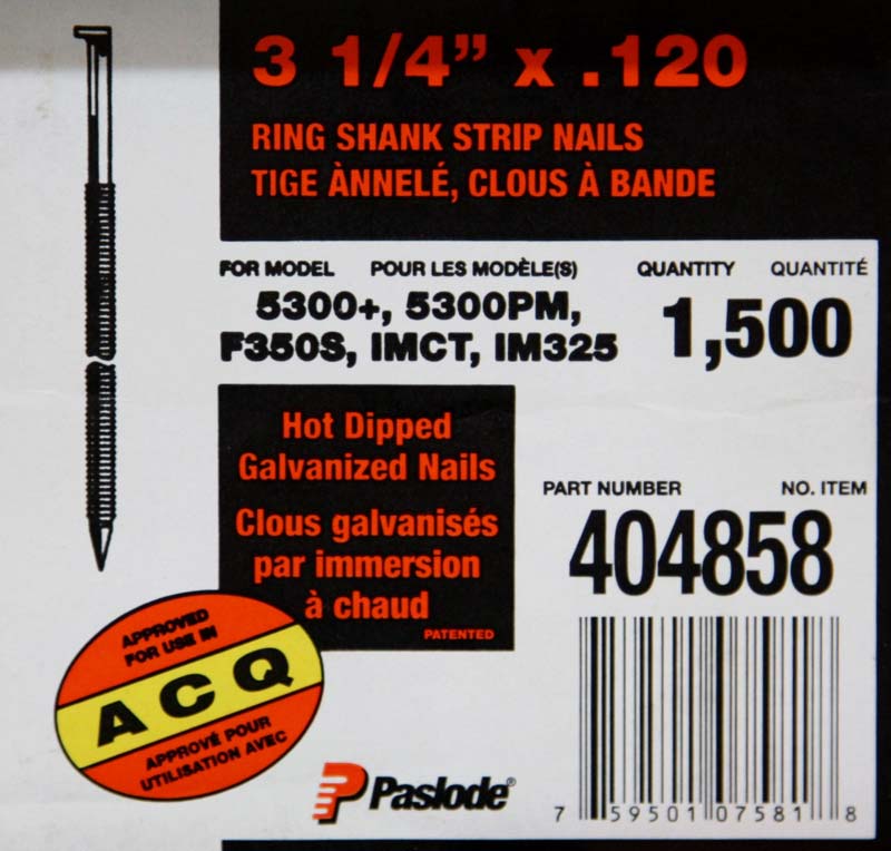 Strip Framing Nails, 3" x .120, 30-Degree, Ring Shank, Galvanized, 1500/box (Paslode) Product Code: 404857 $133.99 Each Add to Cart
