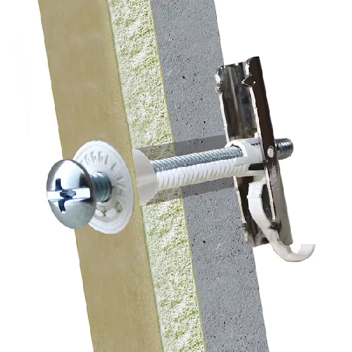 The FlipToggle® anchor’s strong toggling mechanism supplies extra holding power in drywall, plaster or hollow concrete blocks. Its main feature is its ability to be installed in thicker hollow wall material, up to three inches thick.