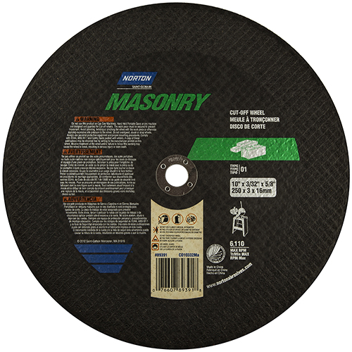 Cut Off Wheel, Masonry, 10" x 3/32" x 5/8", Type 01/41, Stationary Saw