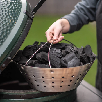 FEATURES & BENEFITS The Big Green Egg Stainless Steel Fire Bowl quickly lifts charcoal out of the EGG to allow for easy cleanup. The two convenient handles provide an easy way to shake out the cool ash to maximize airflow for quicker startups.