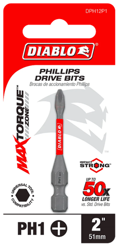 Diablo's driver bit range of Phillips bits delivers maximum performance, extreme durability and up to 50X longer life when installing and removing fasteners.