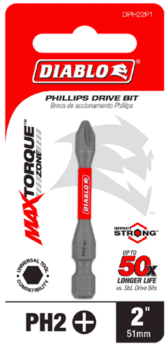 Diablo's driver bit range of Phillips bits delivers maximum performance, extreme durability and up to 50X longer life when installing and removing fasteners.
