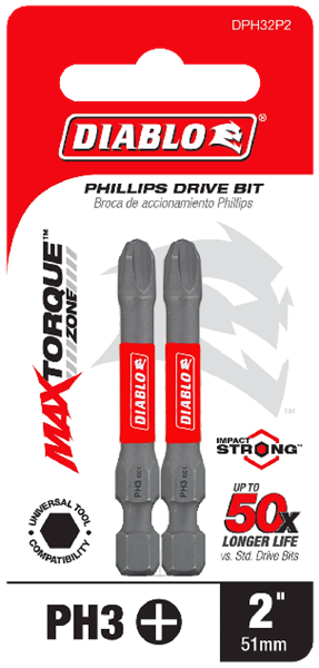 Diablo's driver bit range of Phillips bits delivers maximum performance, extreme durability and up to 50X longer life when installing and removing fasteners.